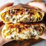 Two hands holding a giant, golden Breakfast Crunchwrap stuffed with crispy hashbrowns, fluffy scrambled eggs, …