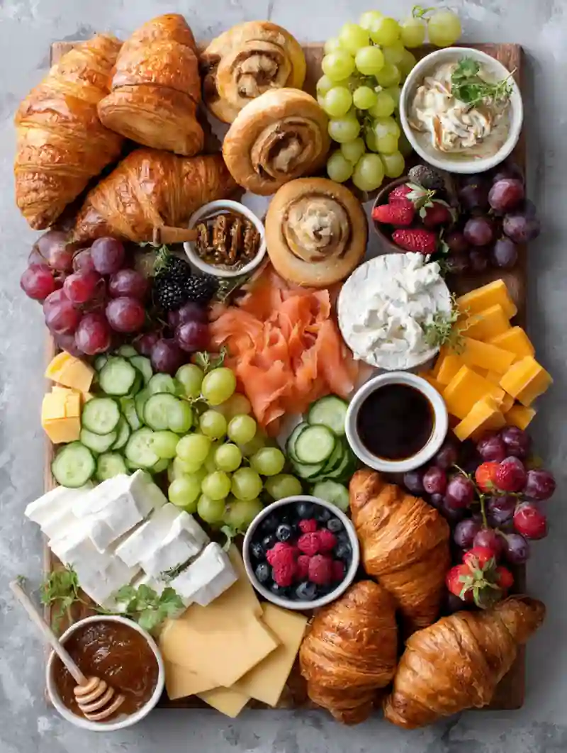 - Balance flavors: Sweet (pastries + honey) + salty (cheese + olives/salmon) + fresh (fruit/veg).