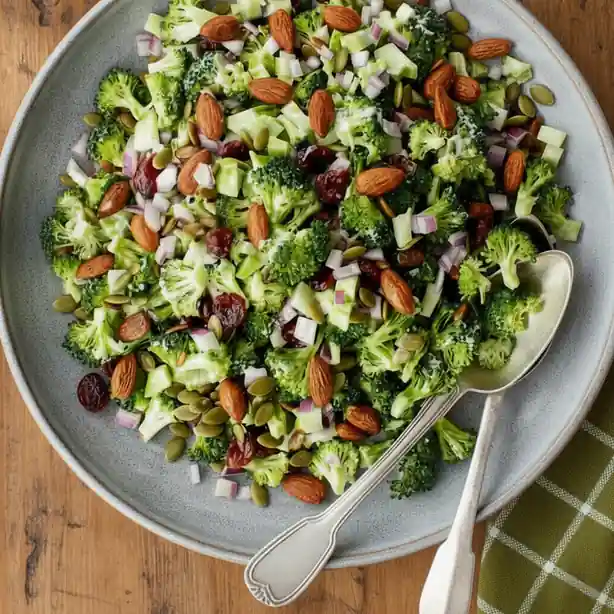 This Broccoli Salad is the ultimate easy side dish for cookouts, potlucks, and weeknight dinners. It’s tangy, refreshing, and packed with sweet and savory flavor but lighter than the traditional version. Made with less mayo and no sugar, meat, or dairy, this healthy broccoli salad features crisp florets, red onion, dried cranberries, and smoky tamari-roasted almonds and pepitas for the perfect crunch. Ready in just 25 minutes, it’s a vibrant, crowd-pleasing side you’ll make on repeat.