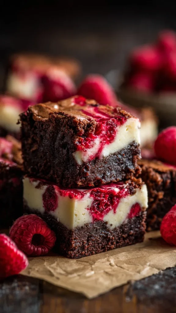Delightful brownies topped with creamy cheesecake and fresh raspberries, perfect for any occasion.