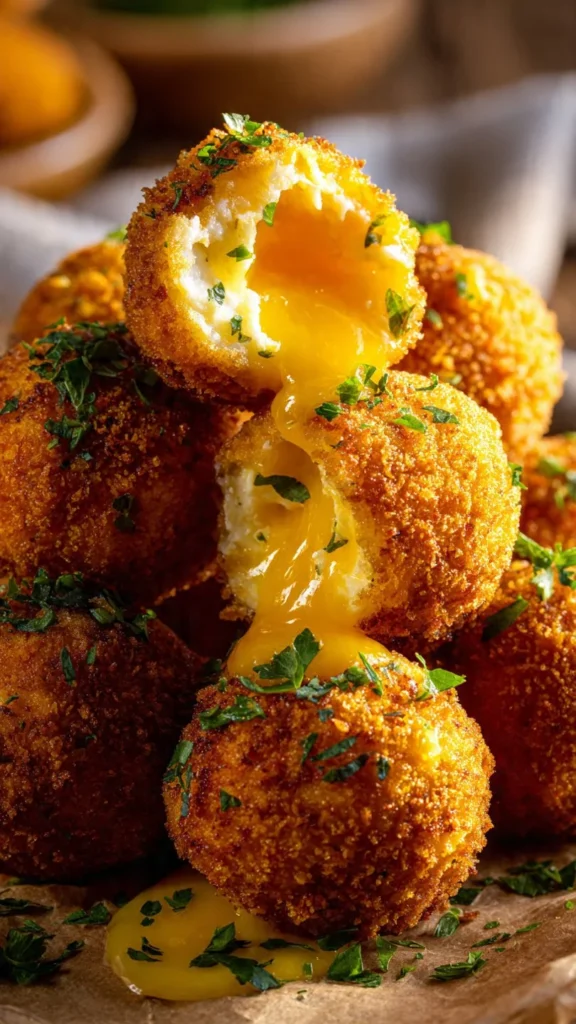- Serve the cheese balls immediately while warm and gooey inside, garnished with extra herbs if desired. Enjoy the crispy exterior and melty interior with your favorite dipping sauce.