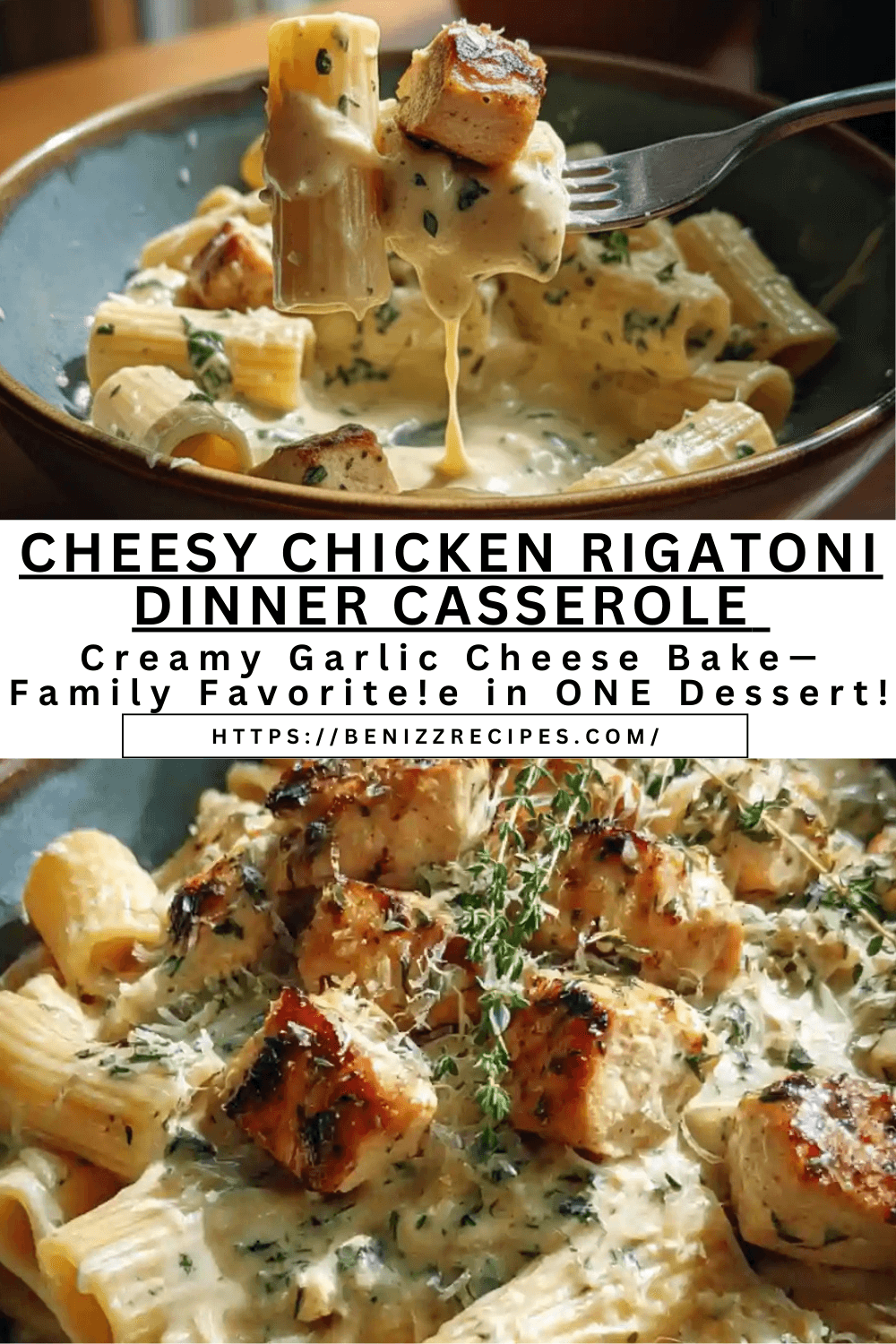This Cheesy Chicken Rigatoni is a creamy, bubbly casserole made with tender rigatoni, juicy cooked chicken, and a garlicky cheese sauce baked until golden. It’s an easy family-favorite dinner that’s also make-ahead and freezer-friendly.