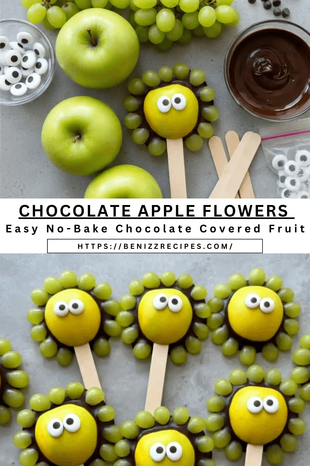 These Chocolate Apple Flowers are an adorable, no-bake dessert that looks like a fancy party treat but they’re surprisingly easy. Crisp Golden Delicious apples get a dark chocolate outline, then you “petal” them with halved green grapes and finish with candy eyes for instant character. They’re perfect for birthdays, classroom parties, after-school snacks, or a fun weekend activity. If you’re searching for chocolate covered fruit ideas or easy fruit snacks that feel special, this one’s a keeper. No oven, minimal mess, and you can prep everything in about 20 minutes. Bonus: kids love helping assemble the “flowers.”