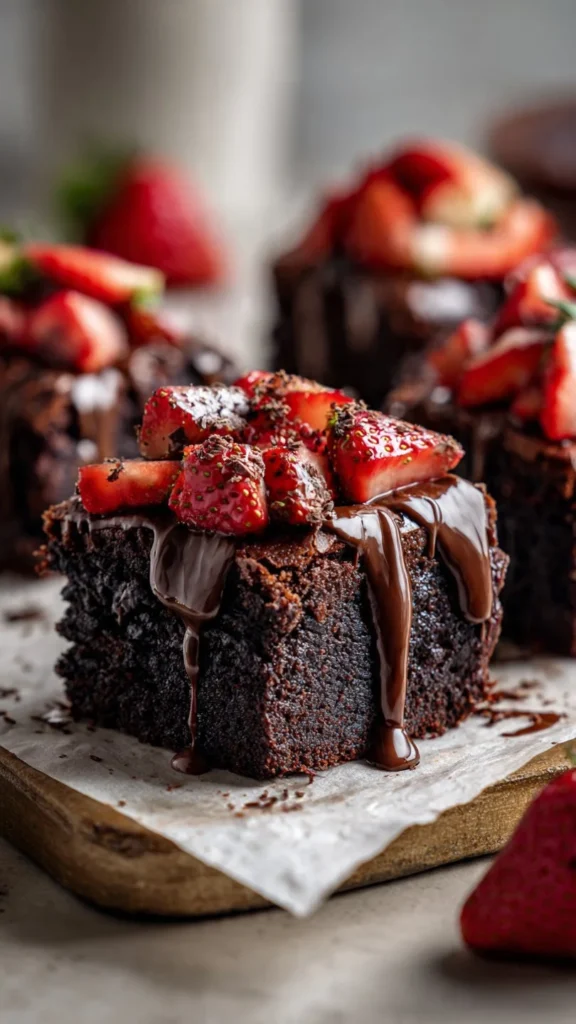 Delightful brownies topped with fresh strawberries and drizzled with melted chocolate, perfect for any occasion.