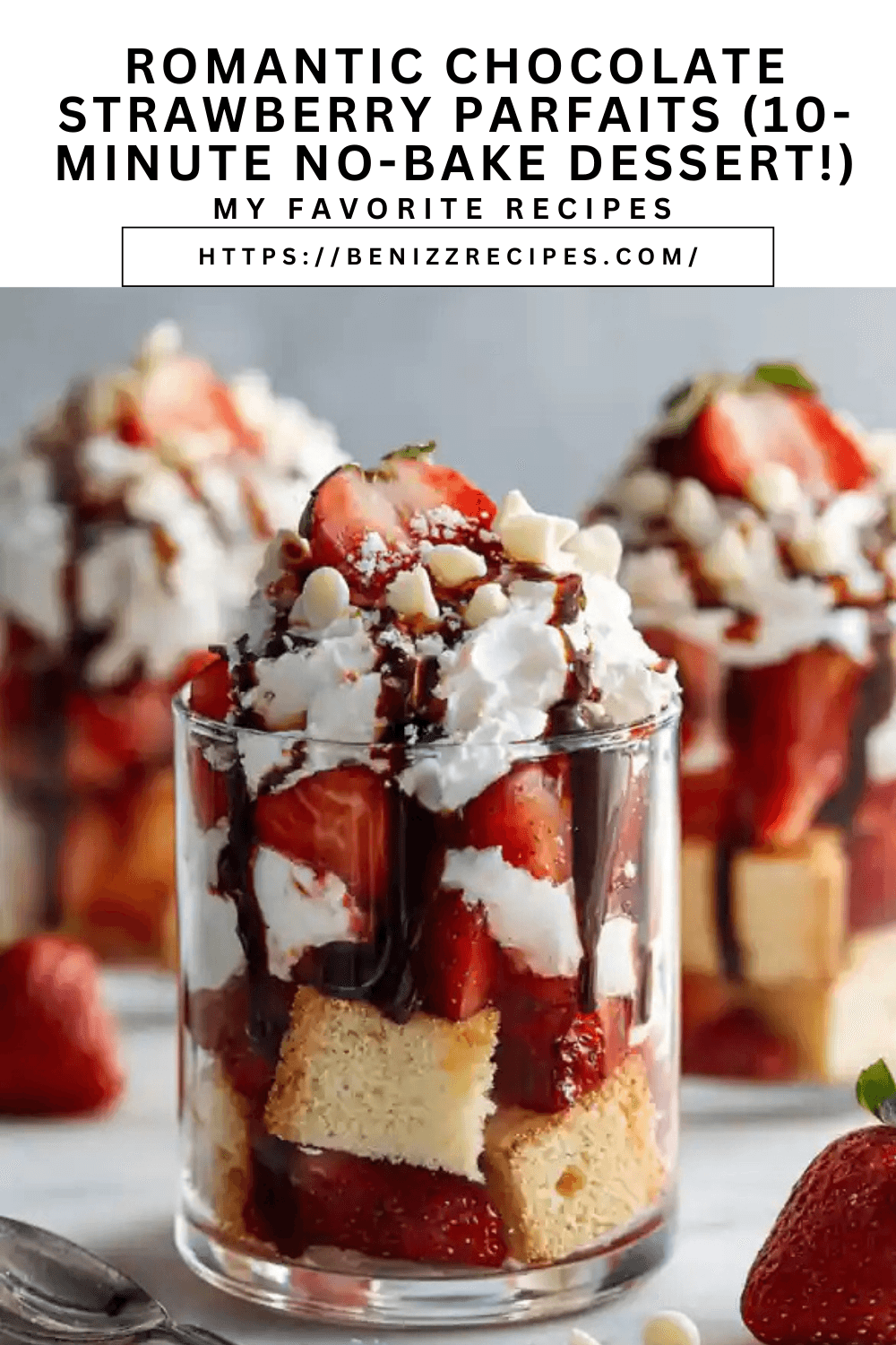 These chocolate strawberry cake parfaits are a quick no-bake dessert made with fluffy vanilla whipped cream, juicy strawberries, diced pound cake, chocolate syrup, and white chocolate chips. Perfect for Valentine’s Day, date night, or anniversaries.