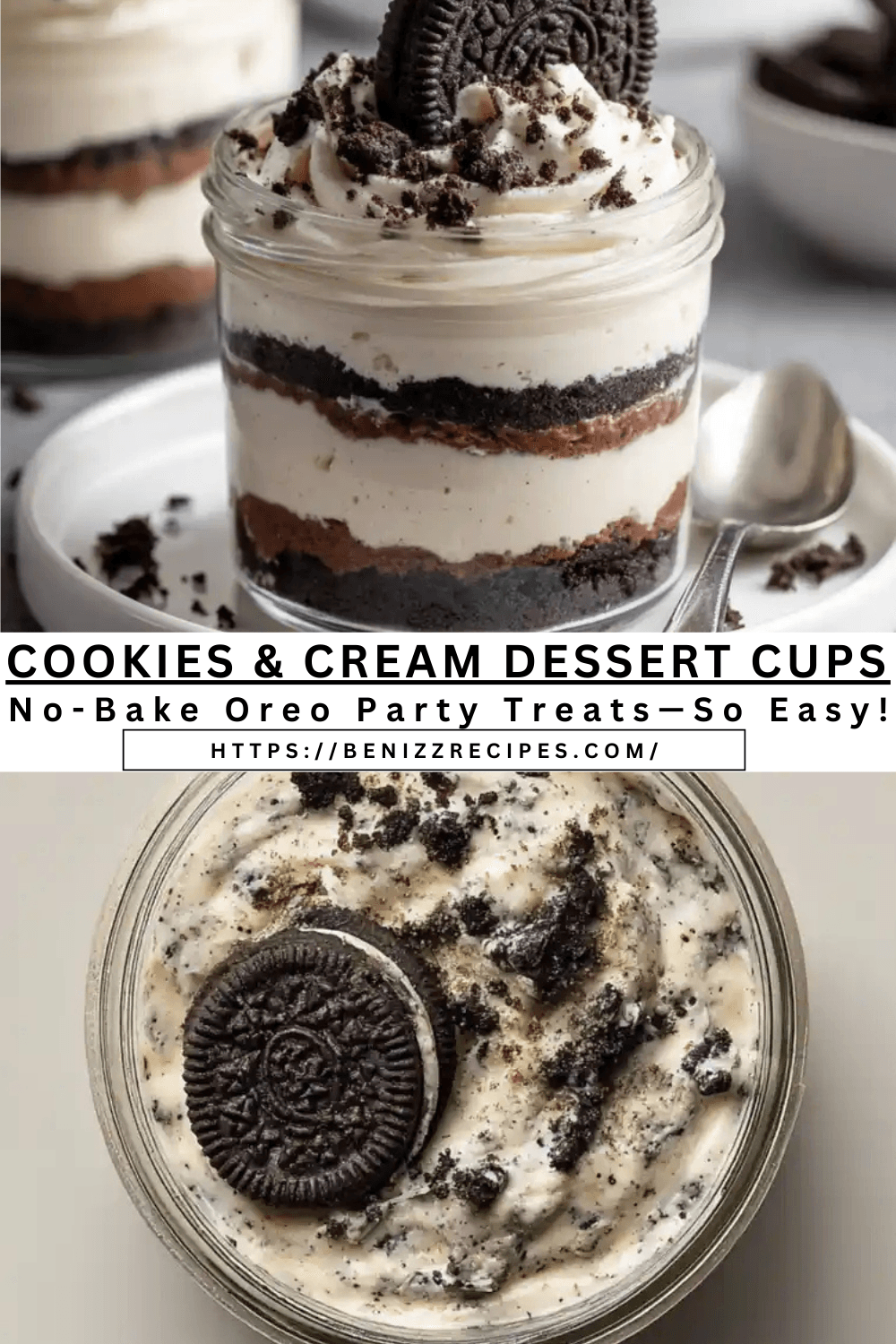 These Cookies & Cream Dessert Cups are an easy no-bake party dessert made with a buttery chocolate sandwich cookie crust and a fluffy cookies-and-cream filling. They’re cute, make-ahead friendly, and perfect for dessert tables and gatherings.