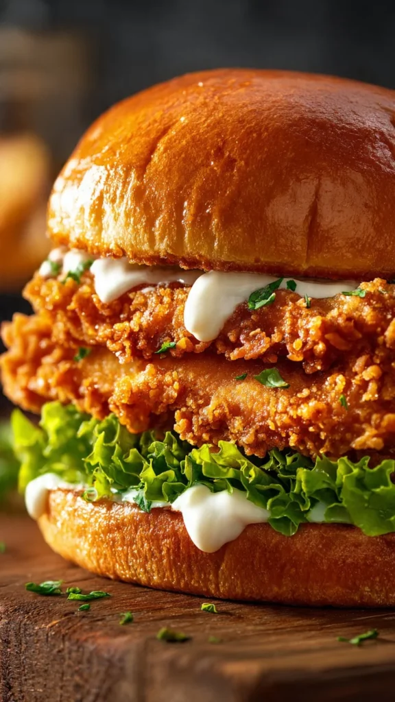 A delicious crispy chicken sandwich with juicy chicken, fresh toppings, and soft buns, perfect for any meal.