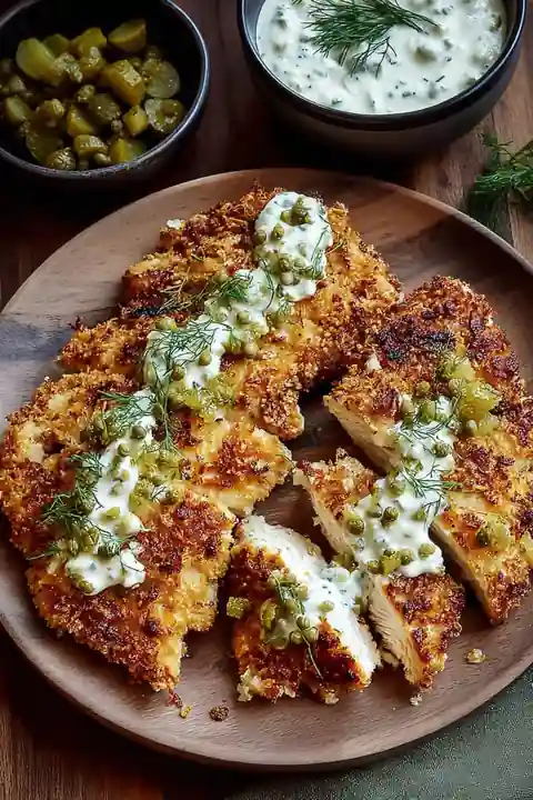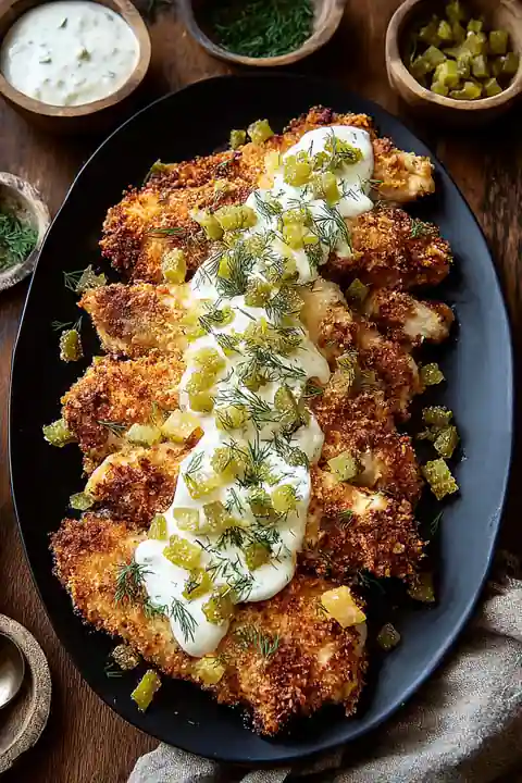 Not at all. The pickle brine adds tang and light seasoning, but it doesn’t overwhelm the chicken with salt. To keep balance, avoid heavily salted breadcrumbs and taste the coating mix before applying.