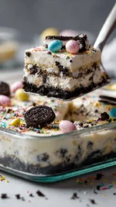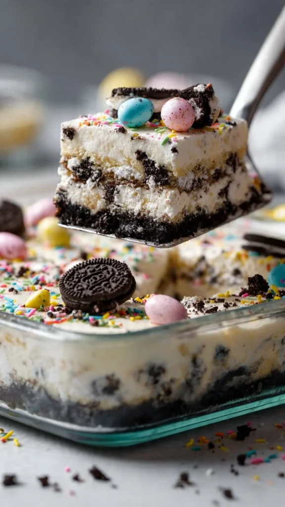 Serve the Easter-themed Dirt Cake cold straight from the fridge. Scoop into bowls or plates and let everyone enjoy their own little garden. This dessert is perfect for parties, picnics, or any Easter celebration.
