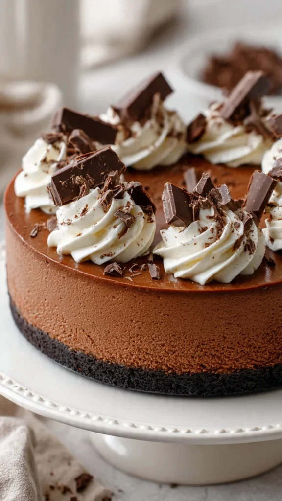 Serving this cheesecake is simple! Slice it into wedges and serve it on plates. You can add extra whipped cream on top for decoration. Some chocolate shavings or a drizzle of chocolate sauce can make it even more special.