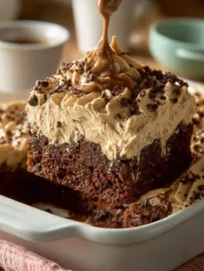 The topping is just as irresistible as the cake itself. A whipped cream frosting infused with espresso powder, Irish cream, and vanilla pudding mix creates a rich, creamy layer that spreads beautifully over the cake. The pudding mix stabilizes the whipped cream, helping it stay fluffy and firm for longer.