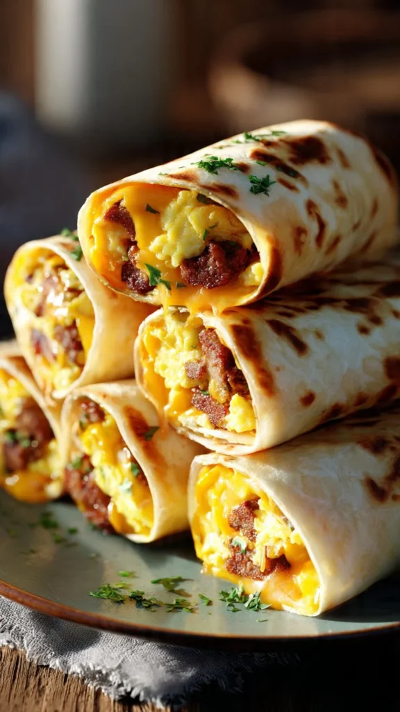 These tasty roll-ups are filled with fluffy scrambled eggs, savory sausage, and melted cheese, perfect for a quick breakfast.