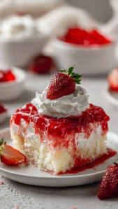 You can serve Jello Poke Cake straight from the pan. Cut it into squares and place each piece on a plate. You might want to add some fresh strawberries or extra whipped topping as a garnish for an extra touch.