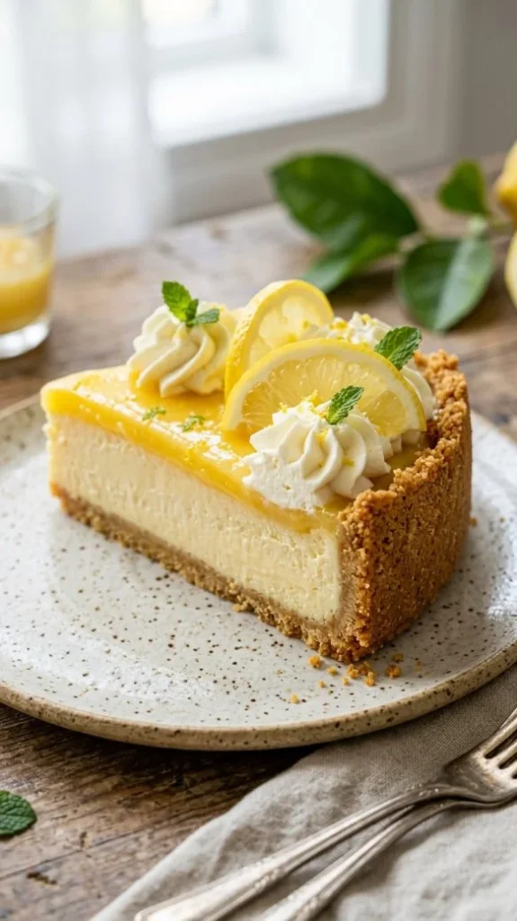 Serve the Lemon Cheesecake chilled for the best flavor. Slice it into wedges and plate it beautifully. Top each slice with a generous dollop of whipped cream and a slice of lemon for an appealing presentation. It pairs well with fresh berries or a drizzle of berry sauce for an extra touch.