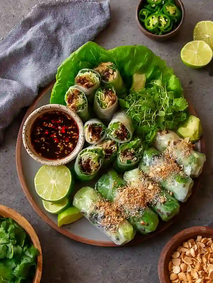 These Lettuce Wrap Summer Rolls are the best of two warm-weather favorites in one: the bold, savory flavor of restaurant-style lettuce wraps, wrapped up in an easy, grab-and-dip rice paper roll. The filling is packed with mushrooms, crispy-edged tofu, crunchy water chestnuts, ginger, and garlic, then coated in a sweet-salty hoisin soy glaze that makes every bite pop. They’re ideal for meal prep, light lunch/dinner, parties, or healthy snacking no heavy cooking required. If you love vegan summer rolls or need fresh lettuce wrap recipes for summer, this is the one you’ll make on repeat.