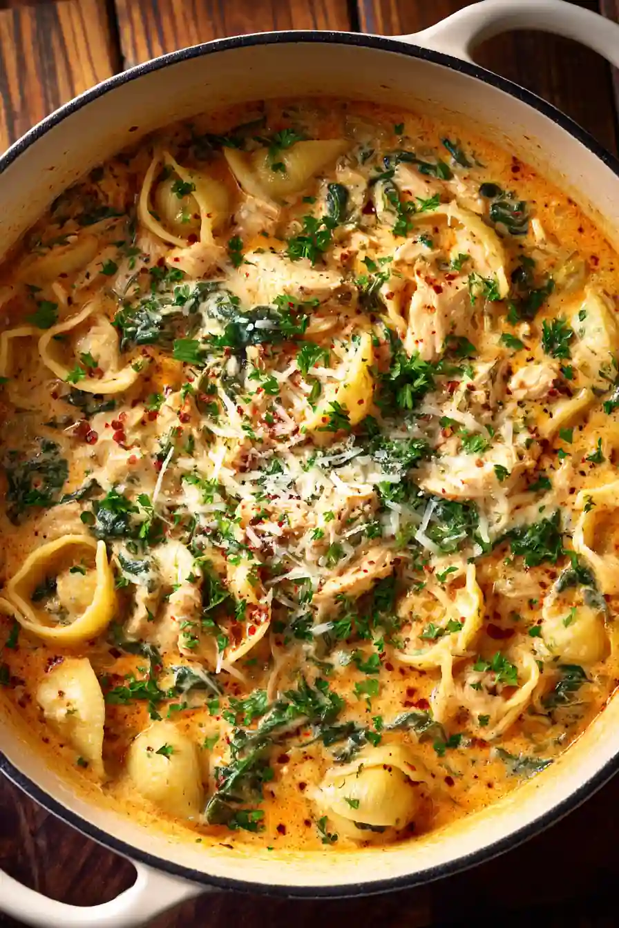 Rustic bowl of creamy Tuscan chicken soup with pasta shells, spinach, shredded chicken, and parmesan cheese