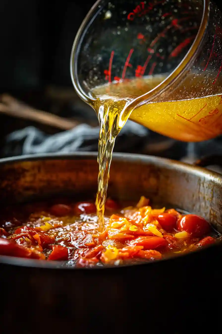 Pour in the chicken stock and 2 cups filtered water, scraping up any browned bits from the bottom of the pan (that’s pure flavor!).
