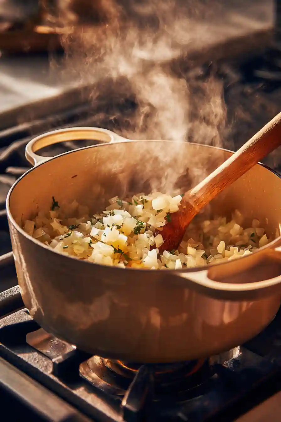 1. Heat a large Dutch oven or heavy-bottom pot over medium-high heat. Add olive oil, diced onion, 1/4 teaspoon salt, and black pepper. Cook for 3–5 minutes, stirring frequently, until the onion softens and becomes translucent.