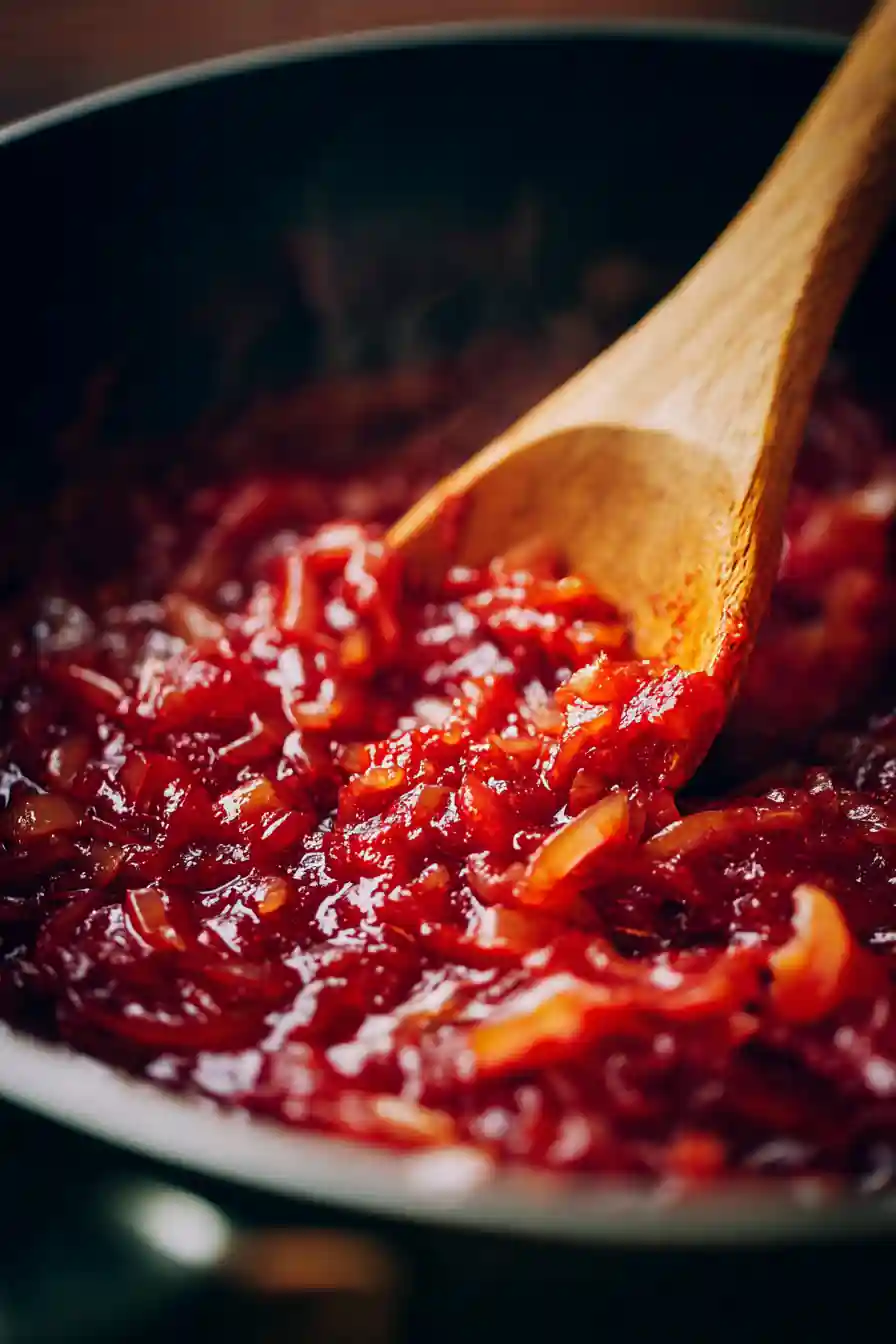 Add the tomato paste and cook for 30 seconds, stirring constantly. The tomato paste will darken slightly and become more concentrated in flavor.