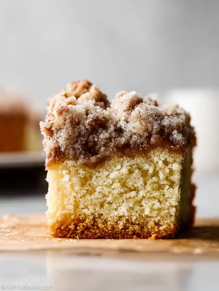 Unlike lighter coffee cakes, this one leans into indulgence. The crumb topping isn’t just a garnish it’s the star of the show. Thick, crunchy, sweet, and perfectly spiced, it sits generously on top of a soft, moist cake base that’s rich with butter and tangy sour cream.