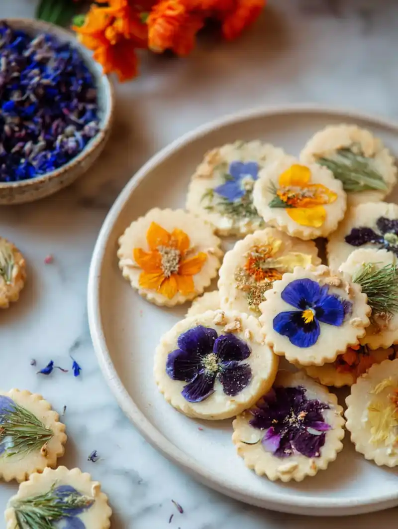 - Decorate tops with edible flower petals and herbs, pressing gently into the dough.