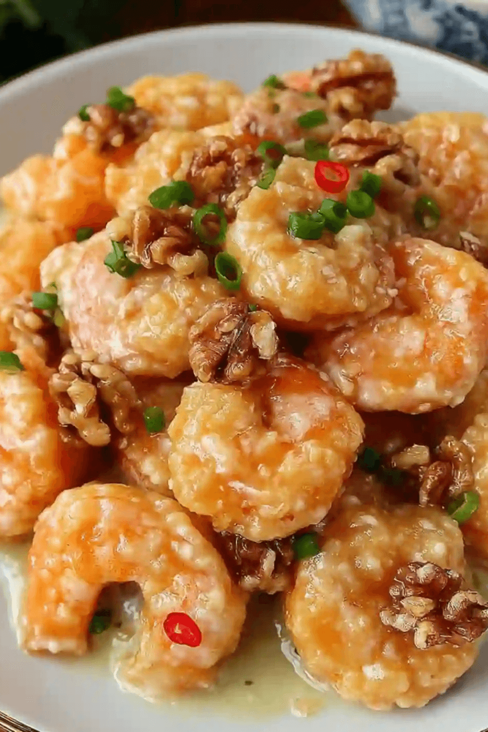 Combine shrimp, candied walnuts, and sauce. Garnish with green onions and serve immediately ✨