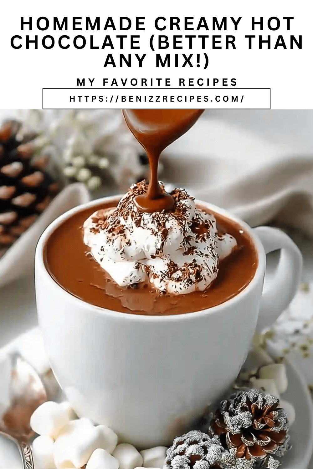 This Homemade Creamy Hot Chocolate is what cold weather dreams are made of thick, velvety, and loaded with real chocolate flavor. Forget the packets; this cozy mug of goodness is made with cocoa powder, real chocolate, and warm milk for a café-style drink that feels extra special. It’s easy enough for a weekday treat but rich and pretty enough for movie nights, holiday gatherings, or snowy afternoons. You can keep it classic, dress it up with whipped cream and marshmallows, or turn it into a fun DIY hot chocolate bar. If you love creamy drinks, chocolate desserts, and simple homemade recipes, this hot chocolate deserves a permanent spot on your winter Pinterest board.
