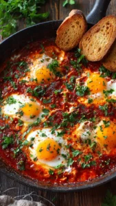 Shakshuka is best served hot right from the skillet. You can pair it with crusty bread or pita for dipping. This makes it easy to scoop up the sauce and enjoy every bite. It’s perfect for breakfast, brunch, or even a light dinner!