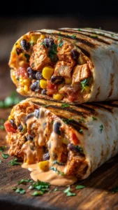 - Assemble wraps by layering rice, chicken mixture, beans, corn, cheese, and sauce on each tortilla.