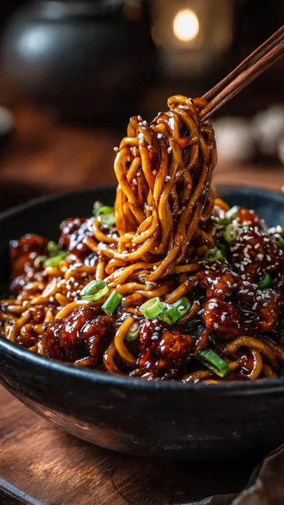 These noodles can be served directly from the pan or plated individually. Just sprinkle the sliced green onions on top for a fresh look. You can pair this dish with a side of steamed vegetables or enjoy it on its own.