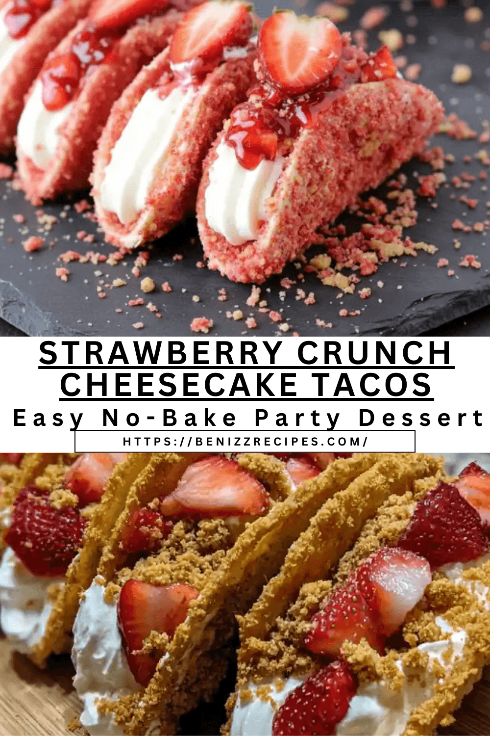 These Strawberry Crunch Cheesecake Tacos are the perfect balance of crunchy, creamy, and fruity sweetness. They’re easy enough for beginner bakers yet impressive enough for celebrations. Whether you’re hosting a party or simply craving a creative dessert, this recipe delivers flavor, texture, and visual wow-factor in every bite.
