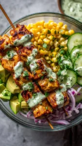 A delicious and refreshing salad combining grilled chicken, sweet corn, and a creamy dressing with cucumbers and spices, perfect for any meal or picnic.