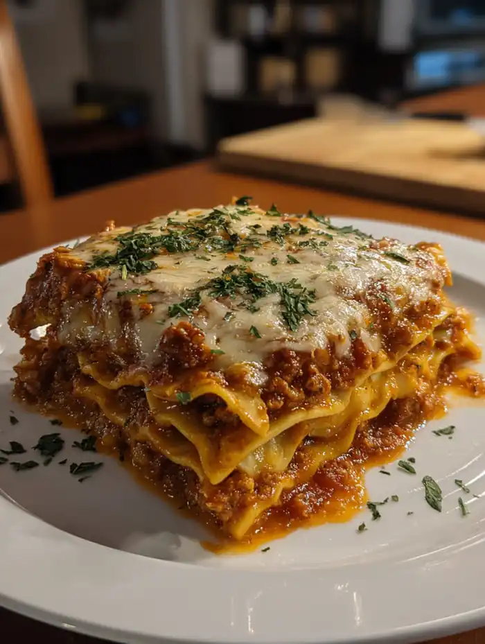 Rich, cheesy lasagna with layers of meat sauce and pasta.